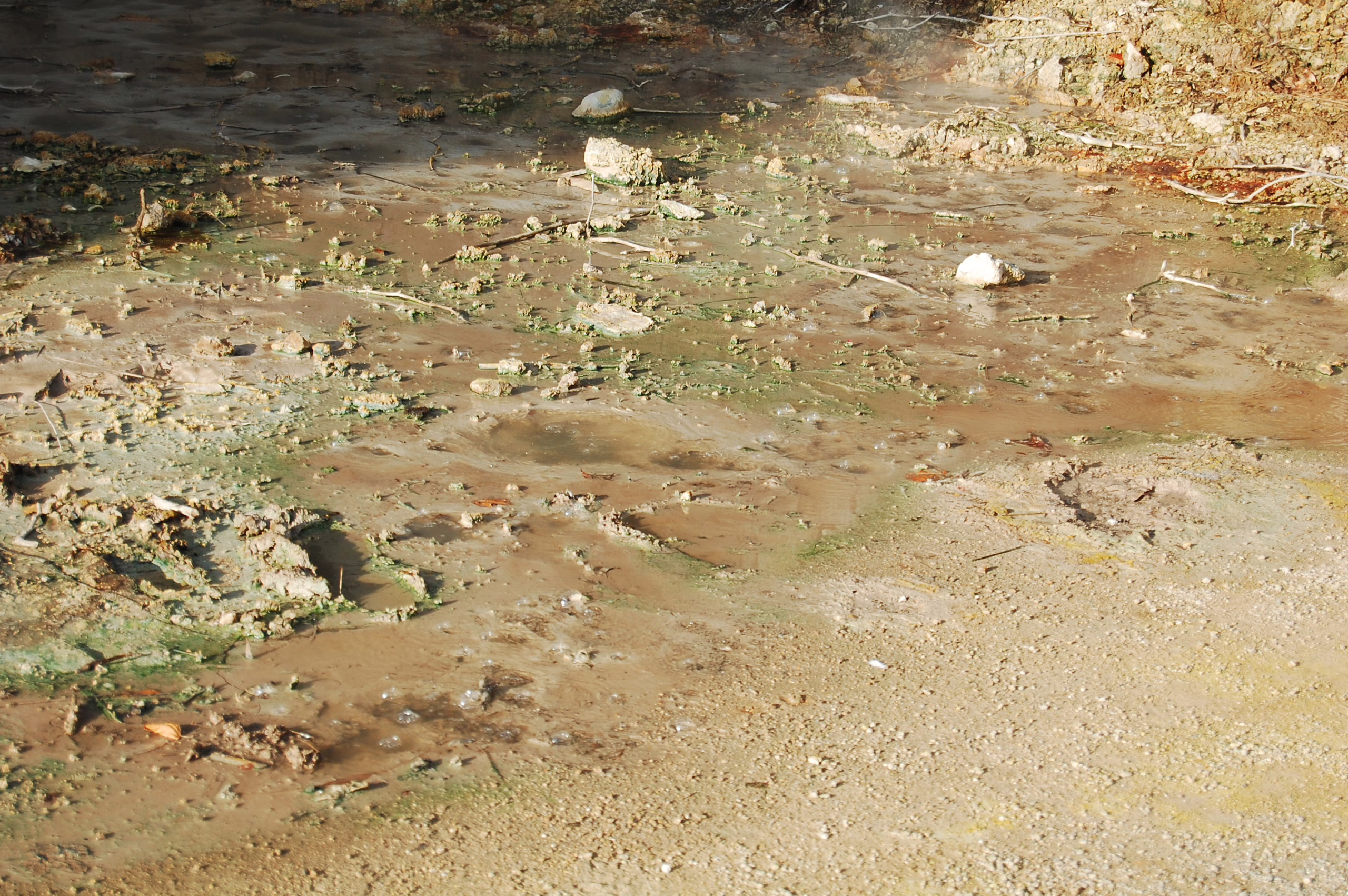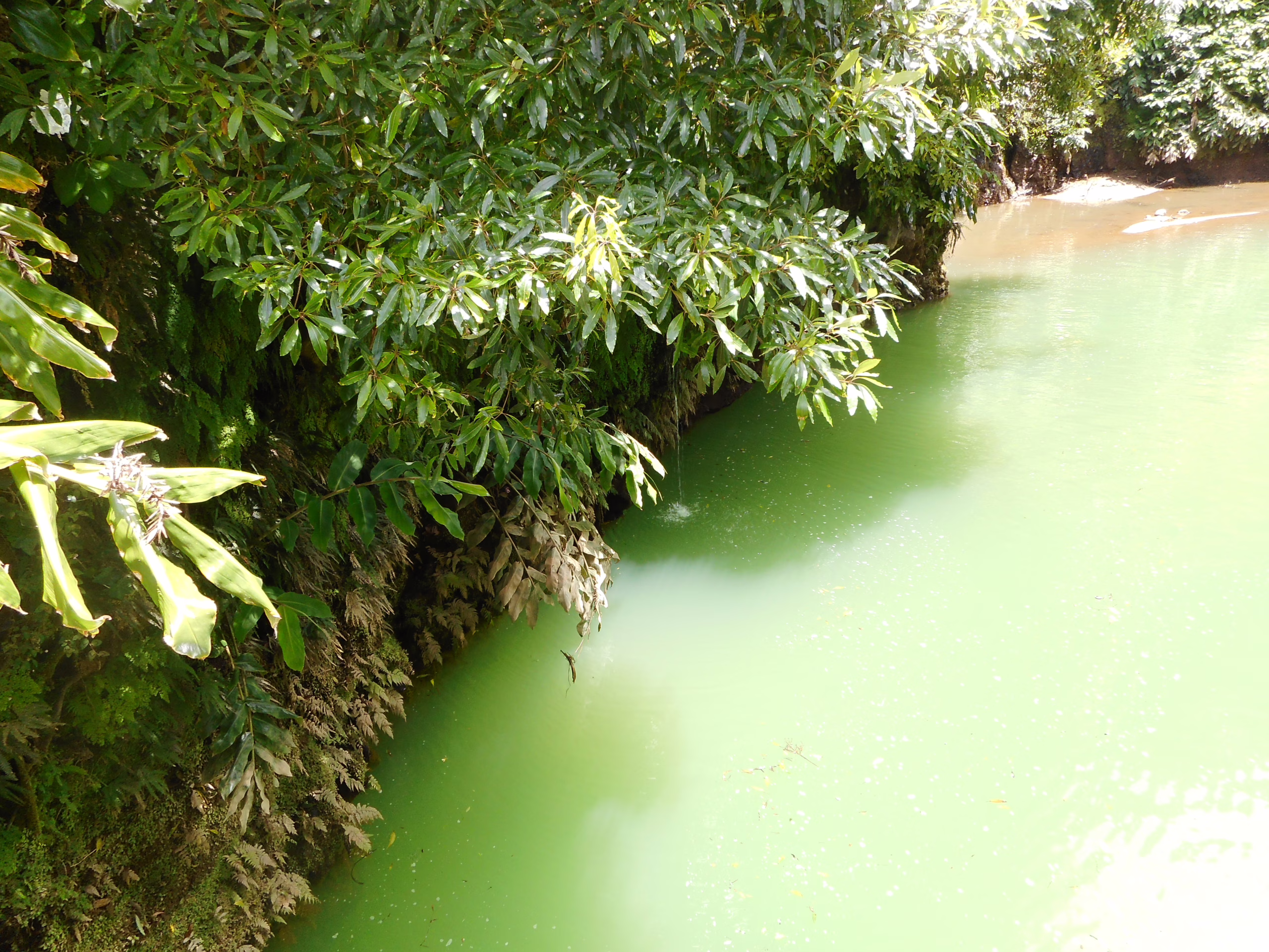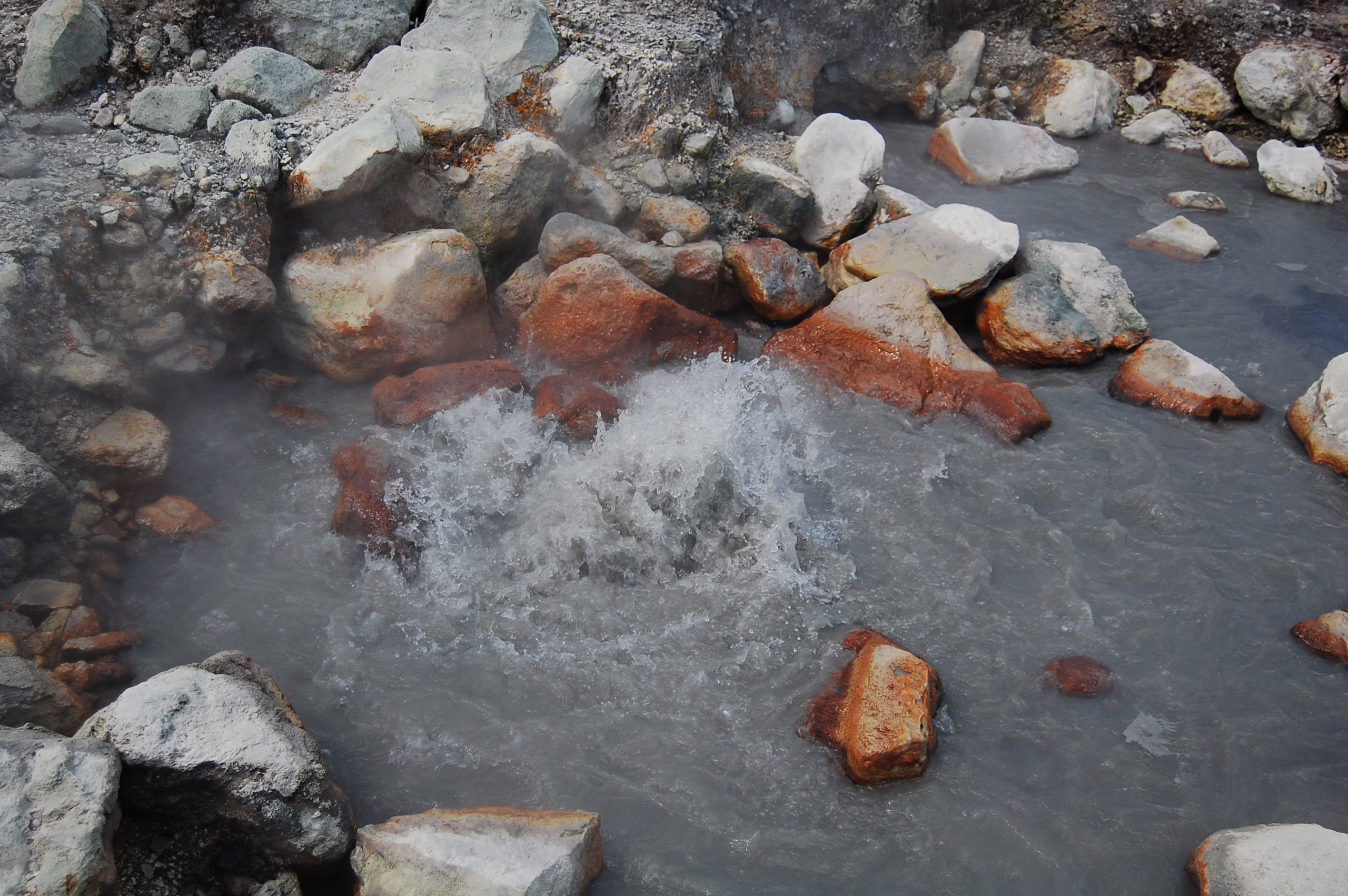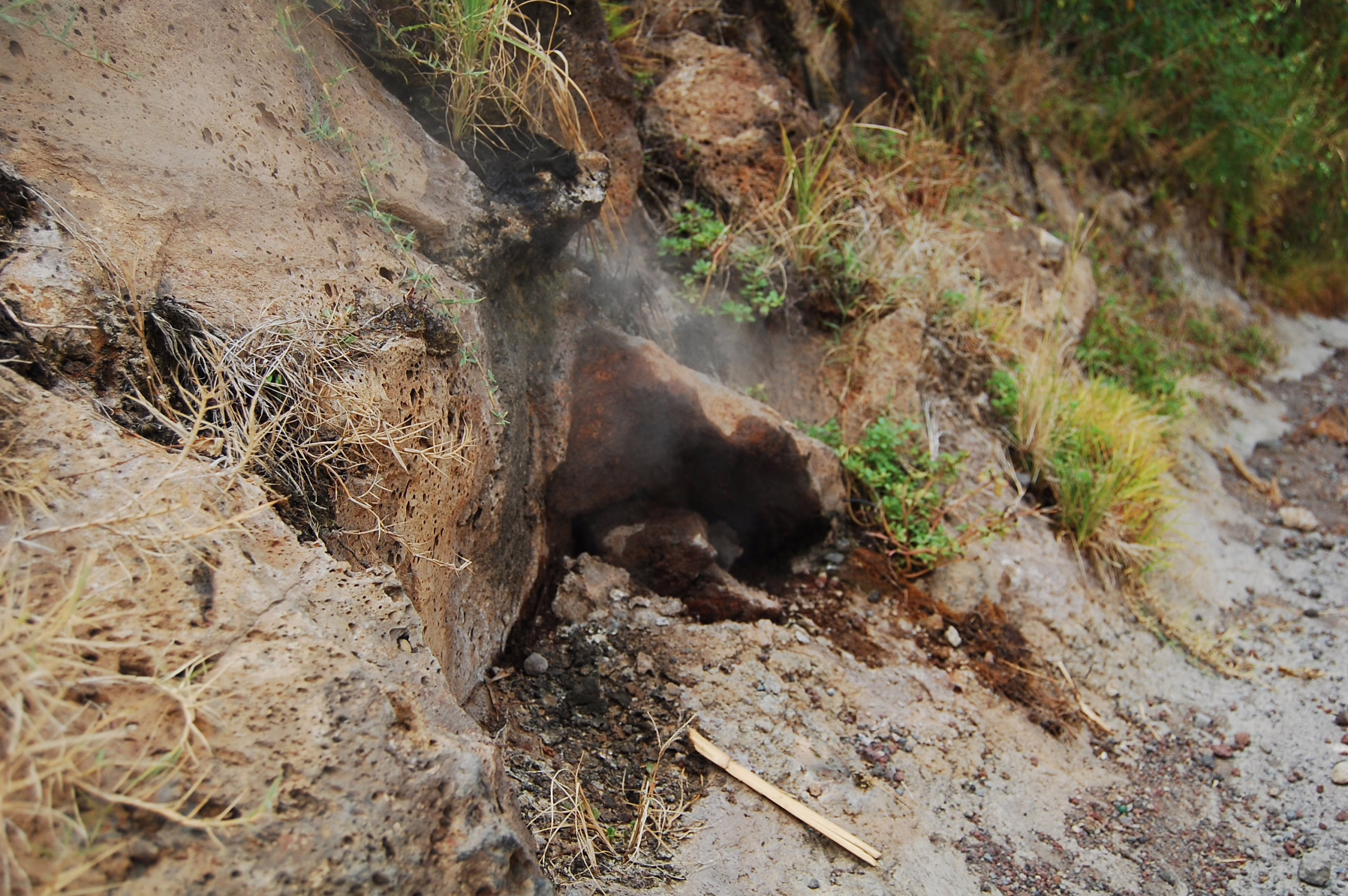 Volným tempem překonáváme první část trasy příjemnou pastvinou a za chviličku odbočujeme k přírodnímu valu, za kterým se vznáší oblaka páry. Štiplavý odér zkažených vajec dává tušit, že tady podzemní oheň stále vře. Míjíme ceduli, která nás varuje, že si nemáme sedat na zem, protože zde dochází k masivním výronům CO2 a zajímalo by mne, zda to někdo někdy přečetl té krávě, co se pod tou cedulí poklidně pase. Chvilku se zde zastavíme a pozorujeme a posloucháme sykot unikající sirné páry. Síla země, i když jen v maličkatém měřítku, je neskutečná. Po pár metrech nás spolkne džungle a my jdeme kolem kamenného koryta, kterým teče voda. Záměrně mlčím, nechci zkazit překvapení, co se objeví po pár kilometrech pochodu.